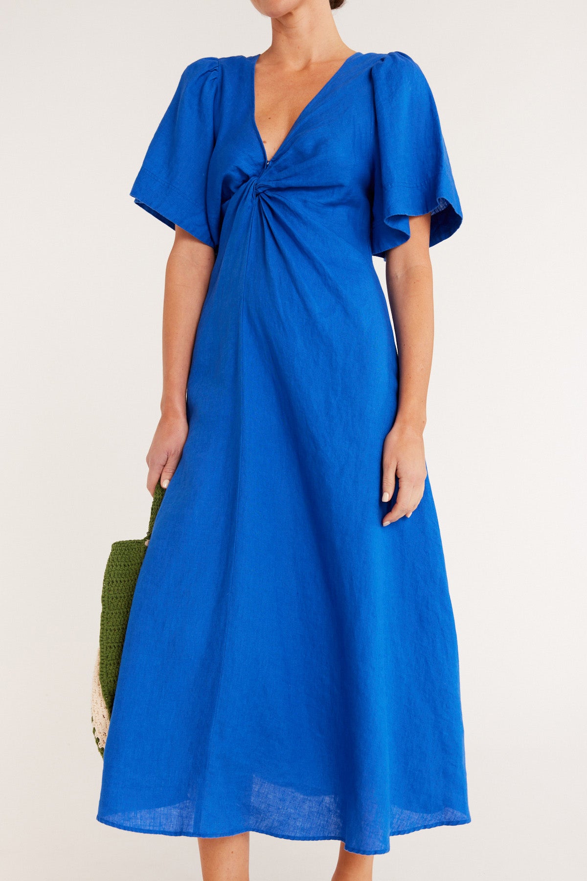 The Pure Linen Twist Dress features a fit and flare silhouette with a front knot detail, crafted in soft linen, making it a refined choice for any occasion.